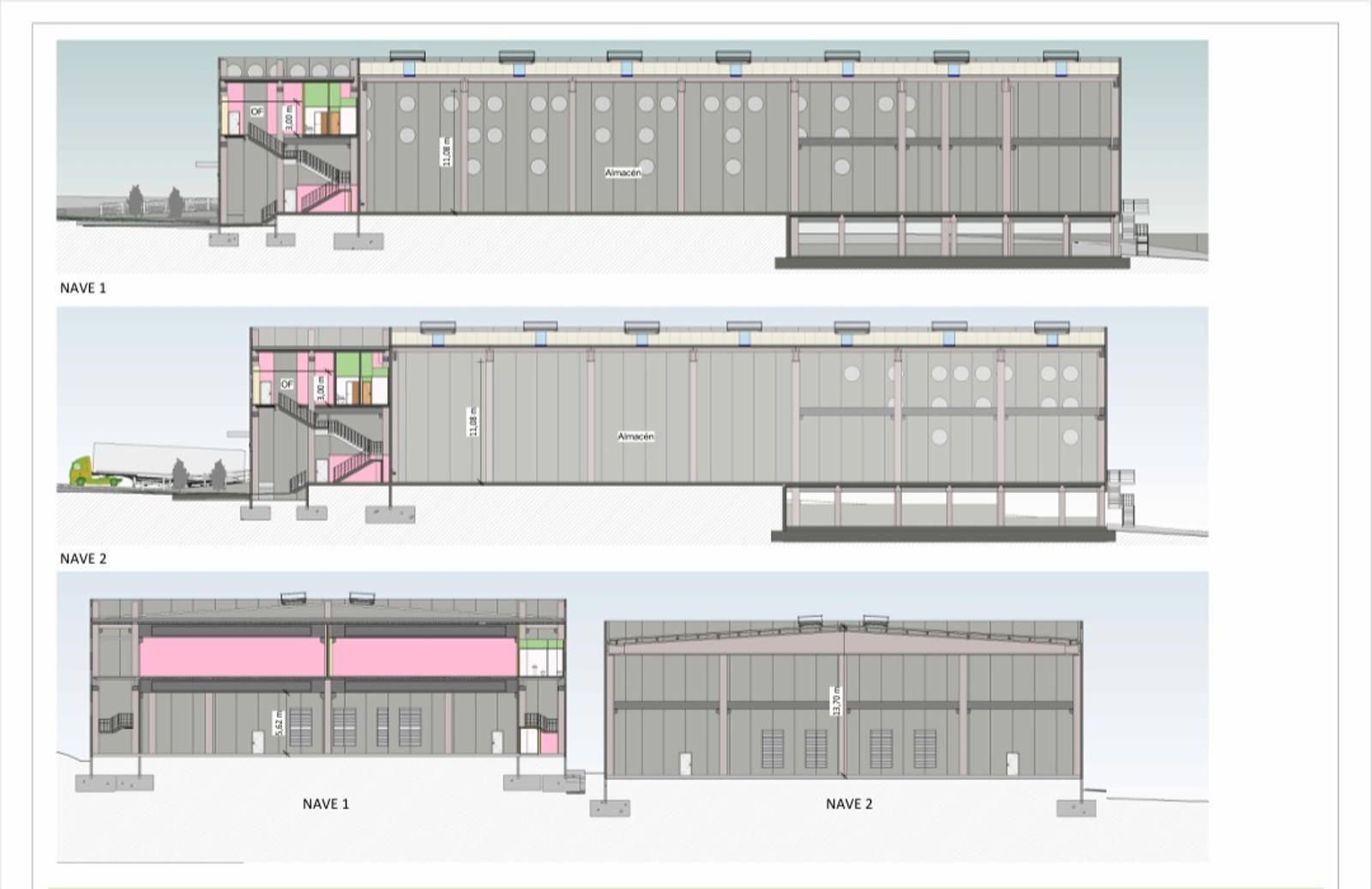 La nave 2 tambien es de tipo C de 4 muelles de carga, de similares caracteristicas, pero 3456 m2 de almacen, de 566 metros de oficina, y 38 plazas de parking.